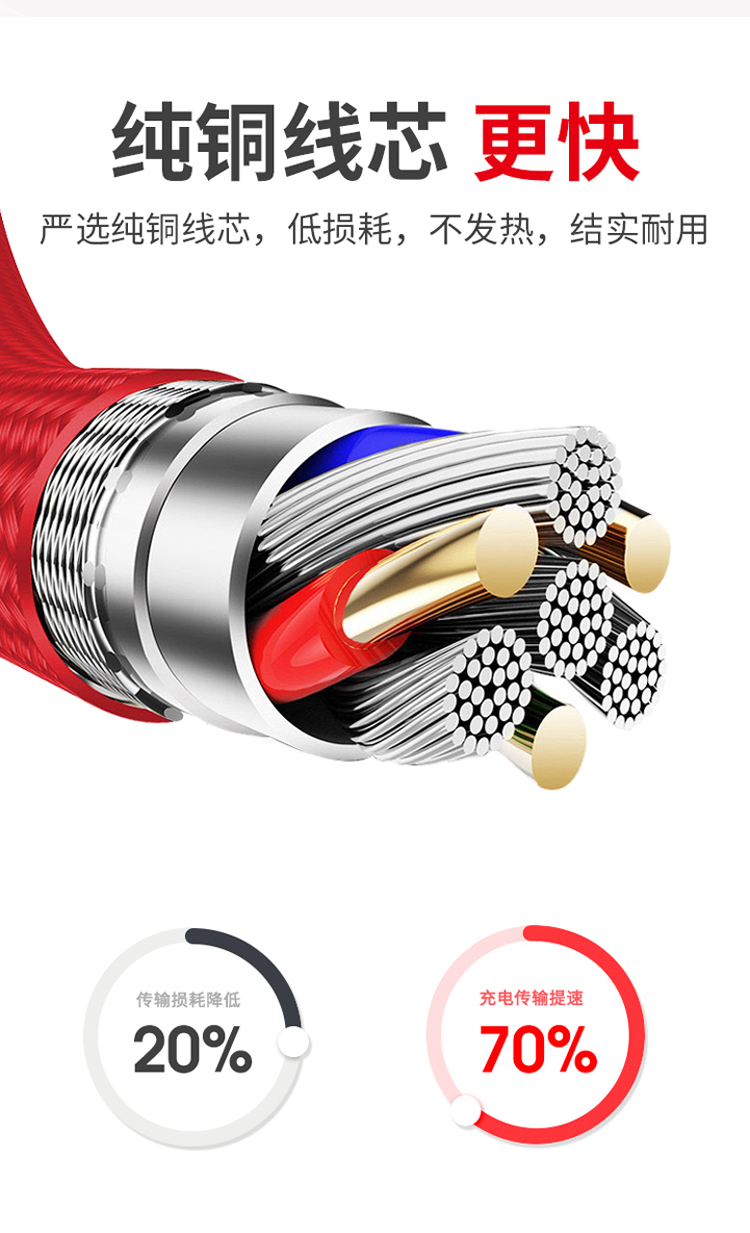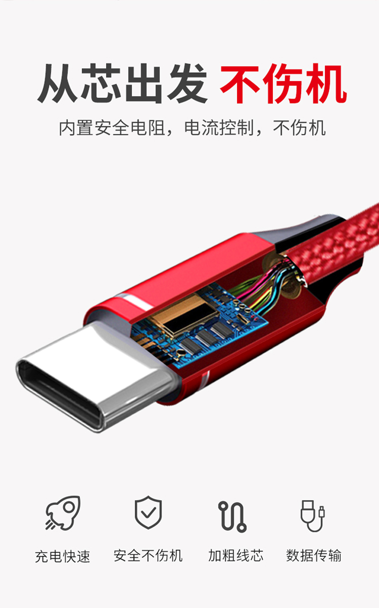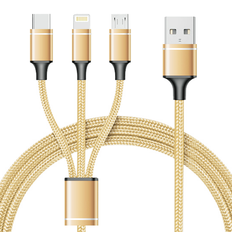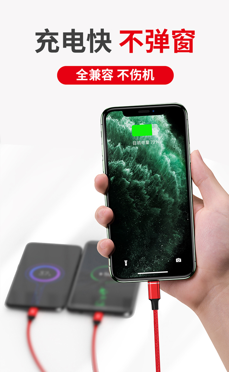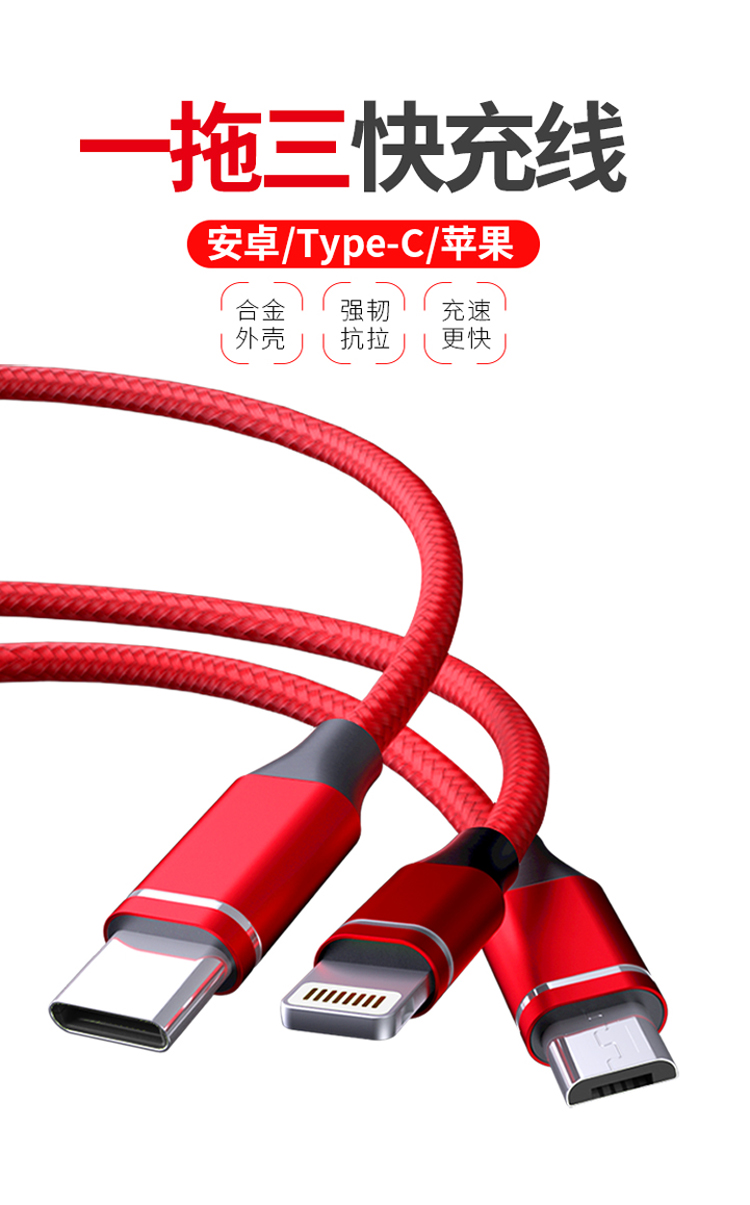 一拖三快充線,安卓/Type-C/蘋果;2.4A安全快充;尼龍編織,更耐用;接頭加固,防開裂;充電快,不彈窗。