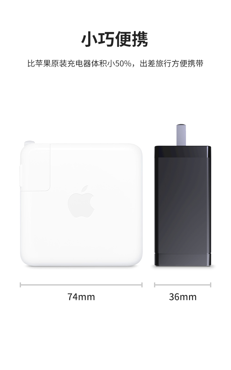 65W大功率,GaN迷你頭;GaN氮化鎵是第三代前沿半導(dǎo)體材料,具有體積小重量輕效率高等特點(diǎn),對(duì)于用戶可大大降低充電時(shí)長(zhǎng),而且還可以為筆記充電;小巧便攜,比蘋果原裝充電器體積小50%,出差旅行方便攜帶。