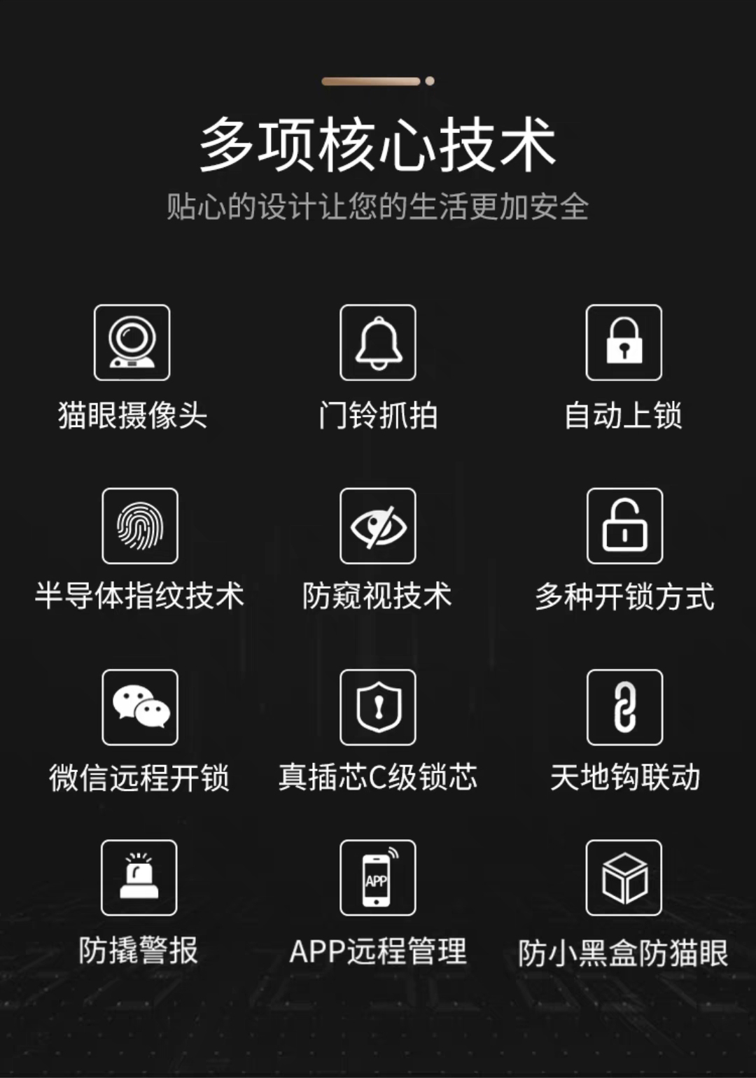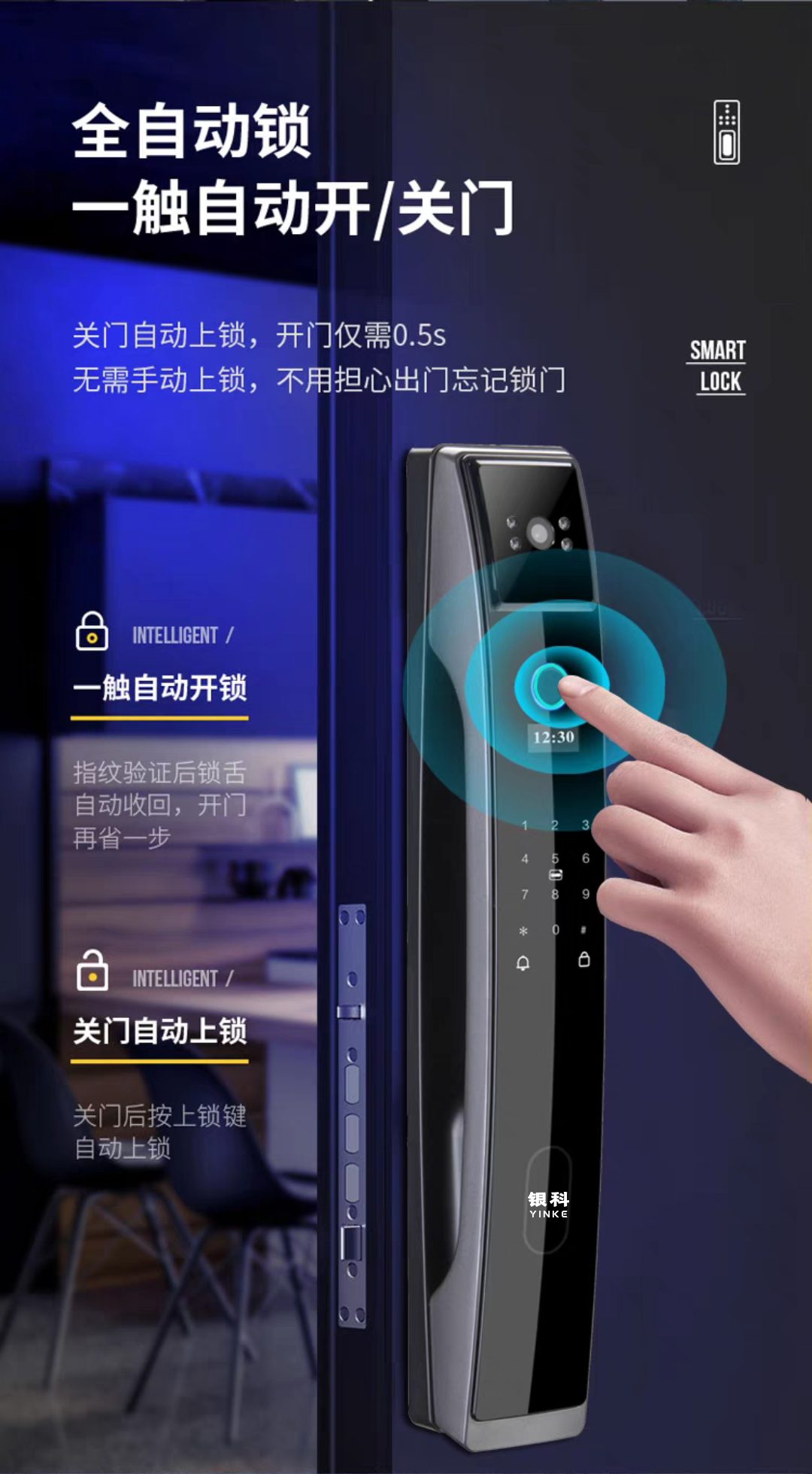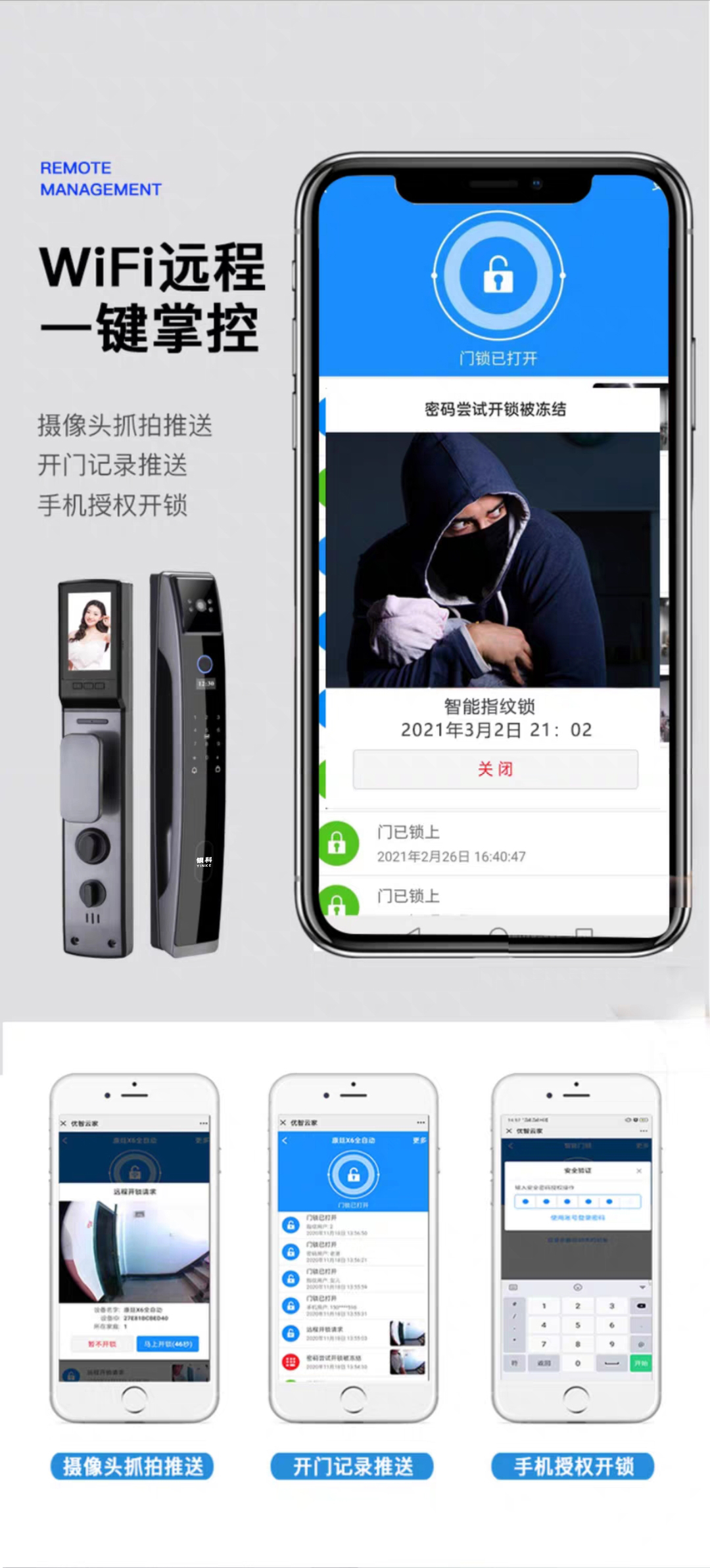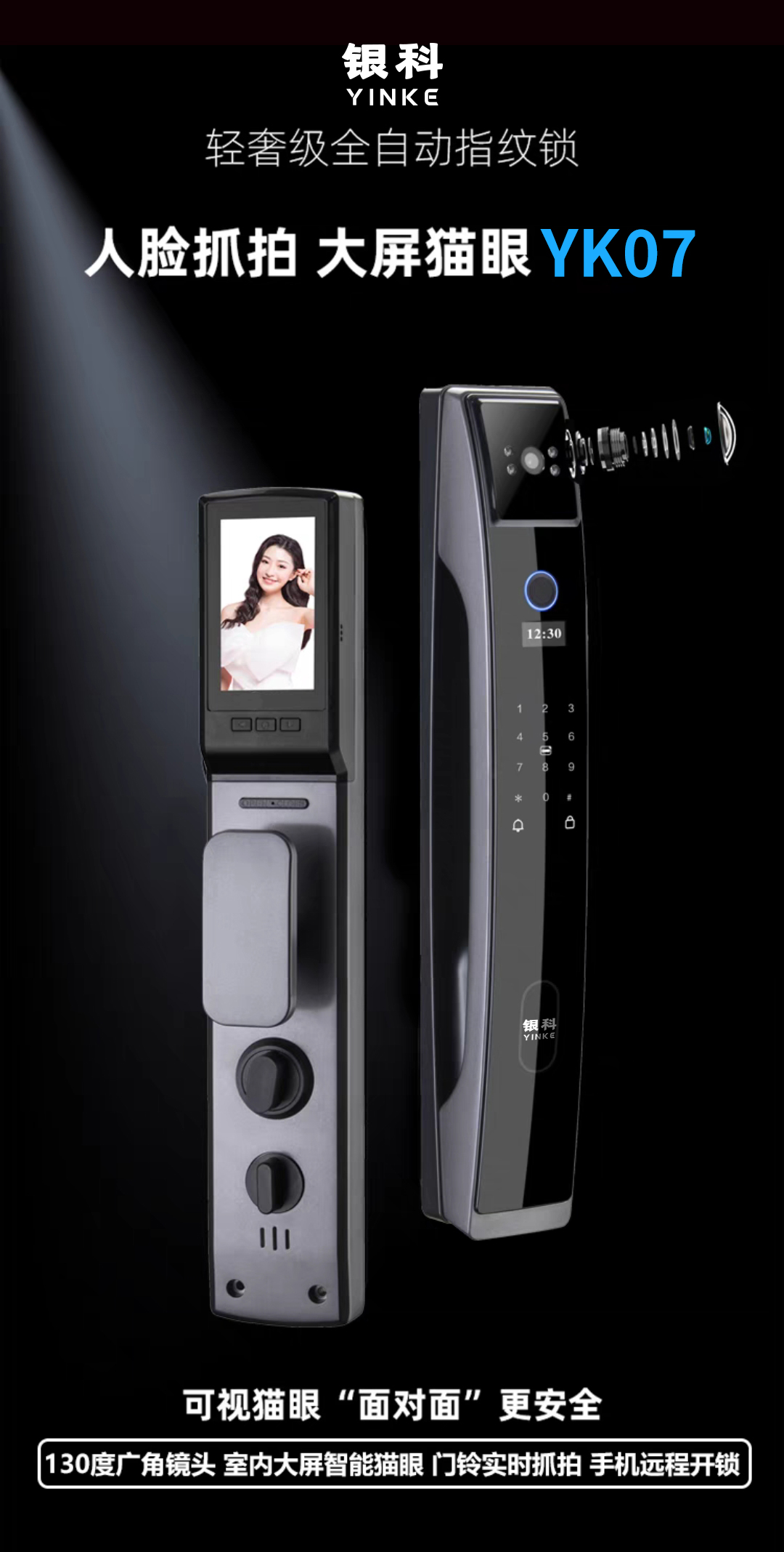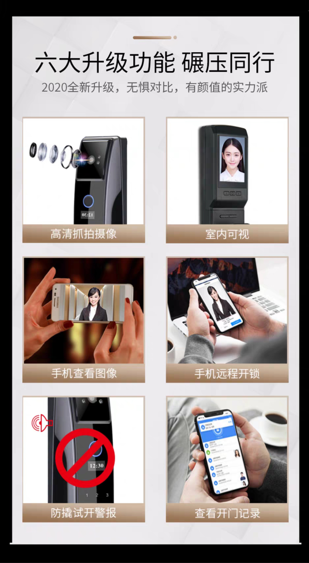 一觸自動開鎖。,關(guān)門自動上鎖,全新六大升級:高清抓拍攝像、室內(nèi)可視、手機查看圖像、手機遠程管理、防撬警報、開門實時記錄查看,多項核心技術(shù)以及更貼心的外觀設(shè)計,讓您的生活更加安全!