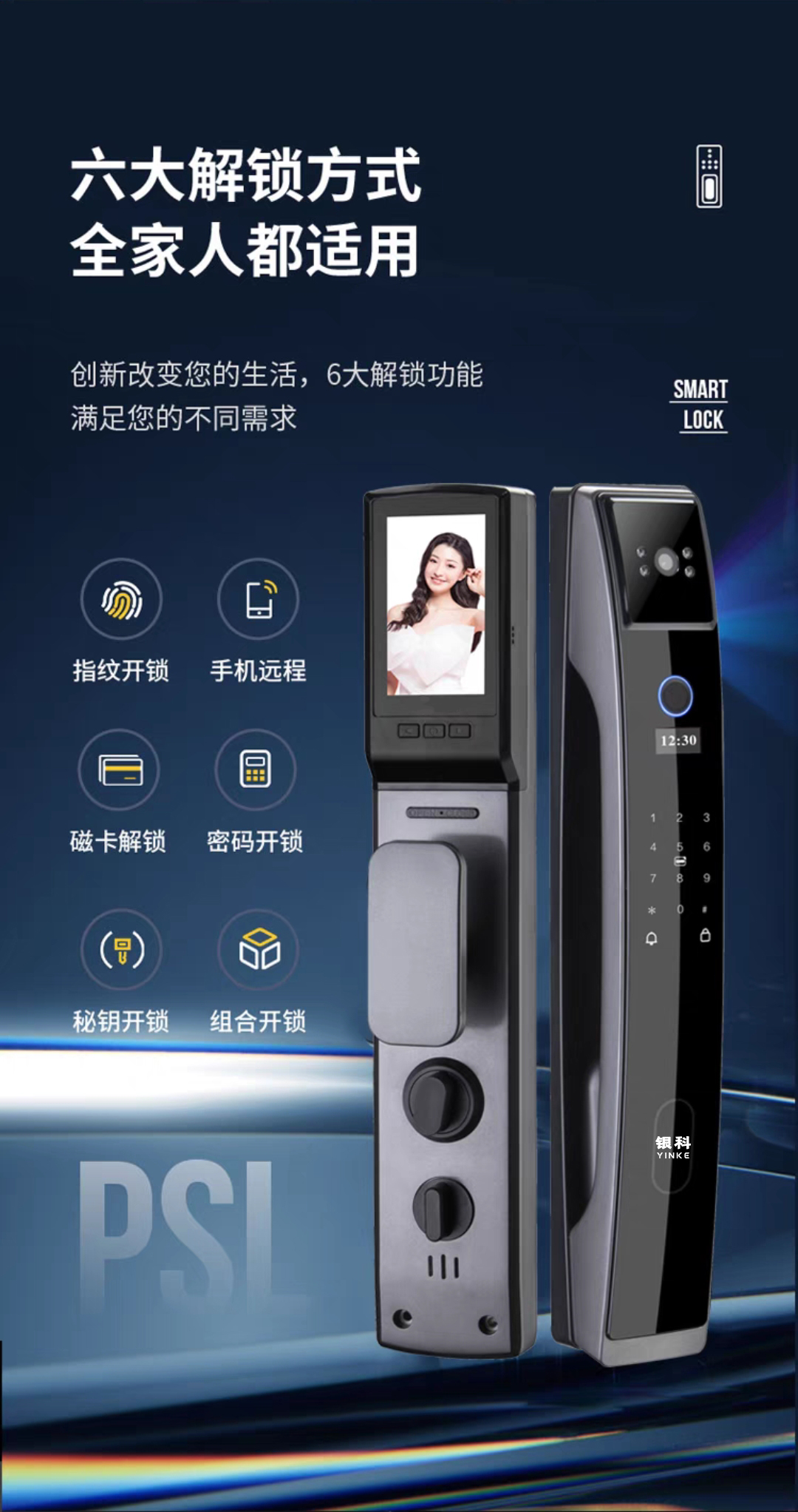 開鎖方式:指紋識別、手機遠程、IC卡識別、密碼識別、密鑰識別、組合識別