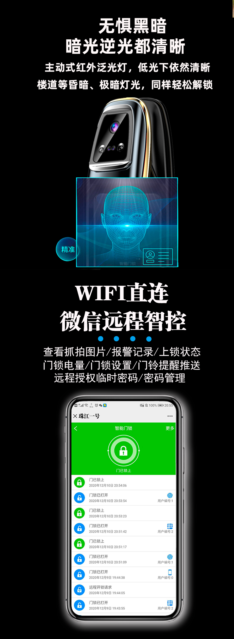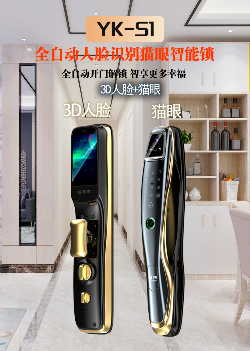 嚴(yán)格挑選材質(zhì),多項(xiàng)科技技術(shù)匯聚,多種開鎖方式滿足您對(duì)日常各種環(huán)境的使用需求,3D人臉+貓眼,智享幸福生活!